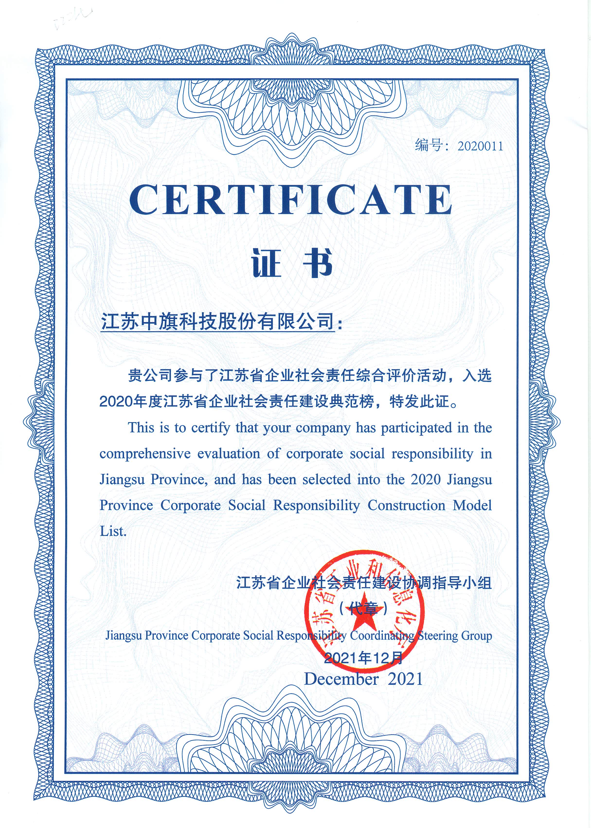 近日,江蘇省工業(yè)和信息化廳發(fā)布《江蘇省企業(yè)社會責(zé)任建設(shè)綜合評價報告(2021)》,以推動相關(guān)行業(yè)和企業(yè)社會責(zé)任建設(shè)成效獲得更快實質(zhì)性進(jìn)展,同時對在社會責(zé)任建設(shè)與承擔(dān)方面工作突出的企業(yè)予以表彰。中旗科技榮登“2020年度江蘇省企業(yè)社會責(zé)任建設(shè)典范榜”。